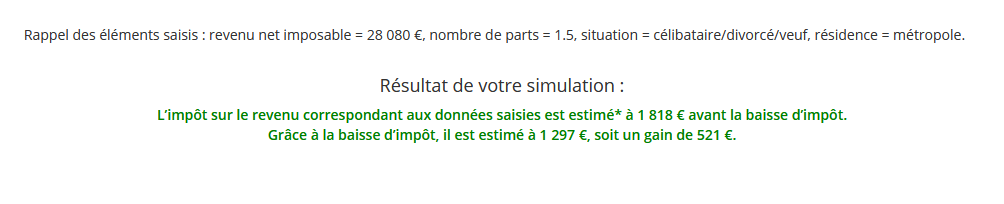 Je dirais que ton problème vient d'une période : ton écart semble être à peu près égal à la baisse d'impôts de 2020. A mon avis si tu mets période = 2020 tu t'en sortiras beaucoup mieux. C'est notamment un petit check sur le site (que je suis probablement le seul à encore utiliser) https://www.impots.gouv.fr/portail/simulateur-de-la-baisse-dimpot-sur-le-revenu-annoncee-pour-2020 qui m'a donné cet indice :