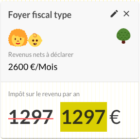 - name: Un adulte et un enfant en métropole, 2600€ de revenus nets par mois. period: 2019 absolute_error_margin: 5 # euros input: individus: Claude: # date_naissance: '1985-11-05' age: 29 statut_marital: 2 categorie_salarie: prive_non_cadre salaire_de_base: month:2019-01:12: 37987.66 heures_remunerees_volume: 1200 taux_csg_remplacement: taux_plein Ines: # date_naissance: '2007-01-01' age: 7 categorie_salarie: non_pertinent famille: parents: - Claude enfants: - Ines menage: personne_de_reference: - Claude enfants: - Ines zone_apl: zone_2 foyer_fiscal: declarants: - Claude personnes_a_charge: - Ines output: revenu_assimile_salaire: [31_200., 0.] # 2600 * 12 nbptr: 1.5 irpp: -1297